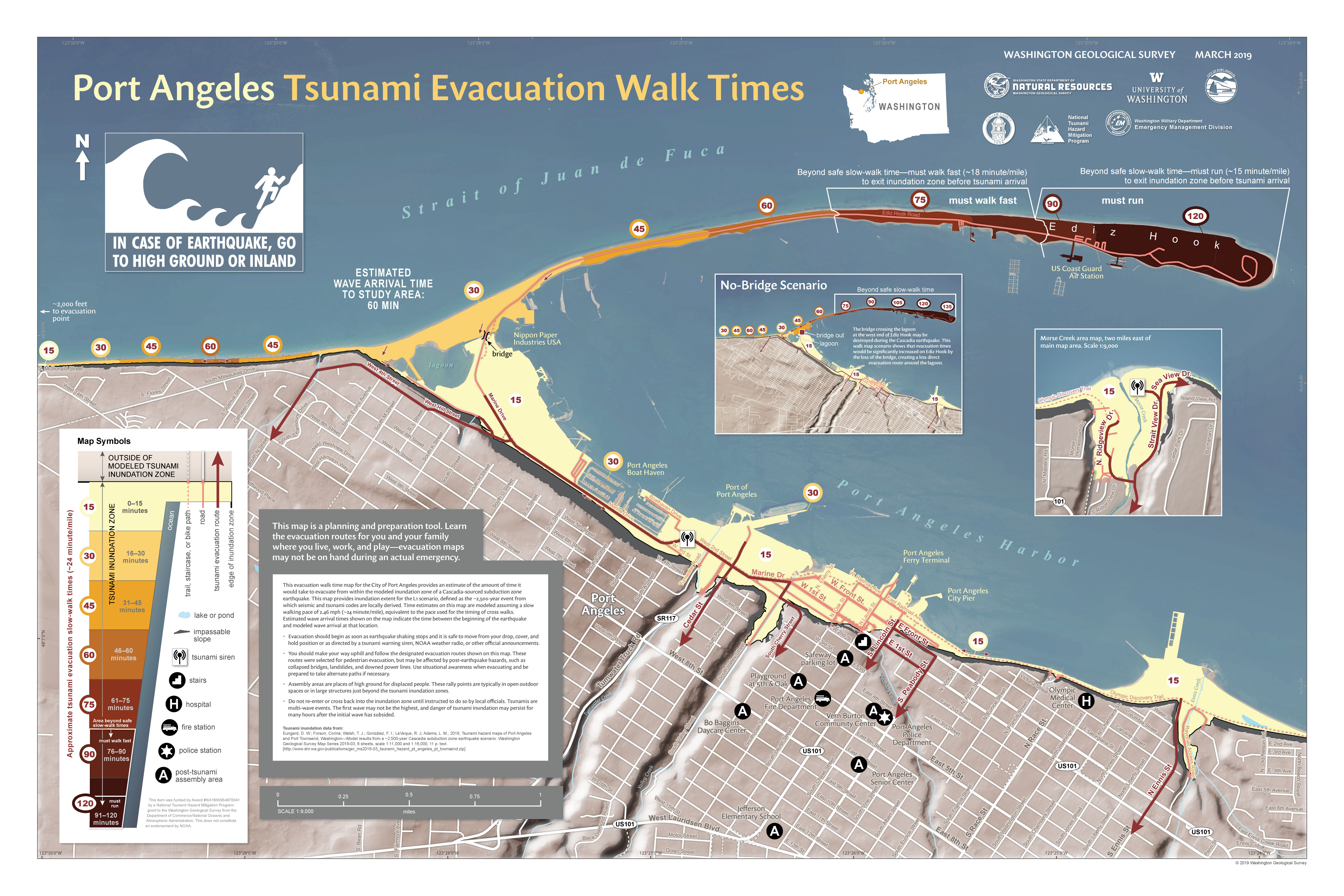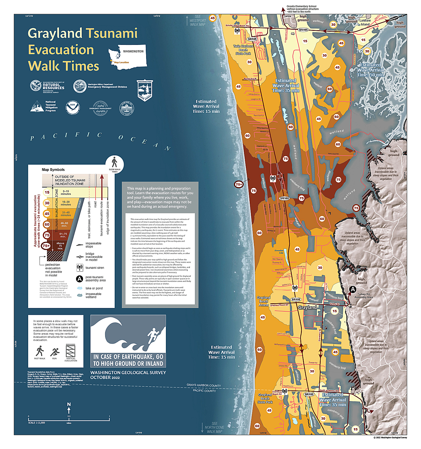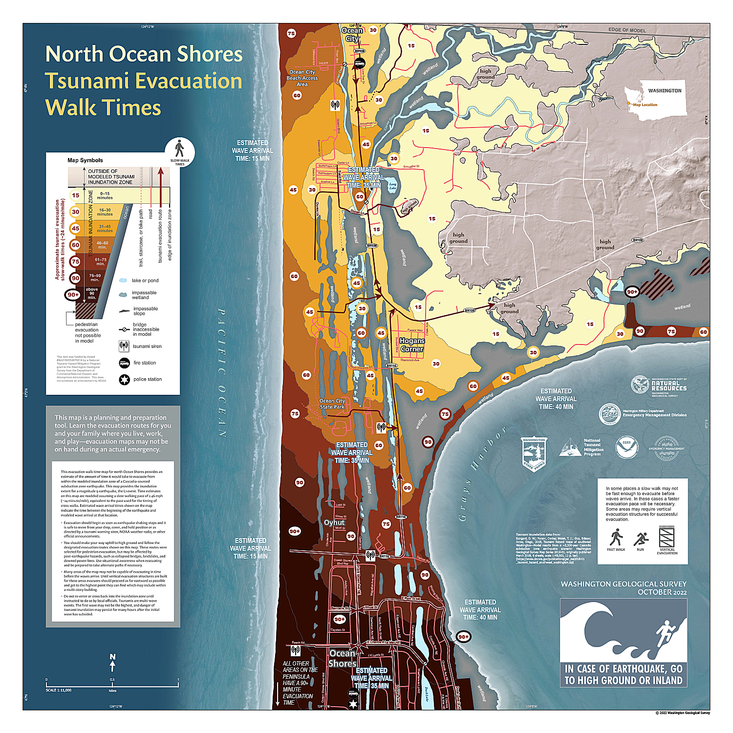 Tsunami evacuation walk time maps show a more detailed view of the time it would take to evacuate on foot from the tsunami inundation zone. The maps also show how long it is estimated to take for the first tsunami wave to arrive. You should use these maps to learn your routes ahead of time for home, work, and school.