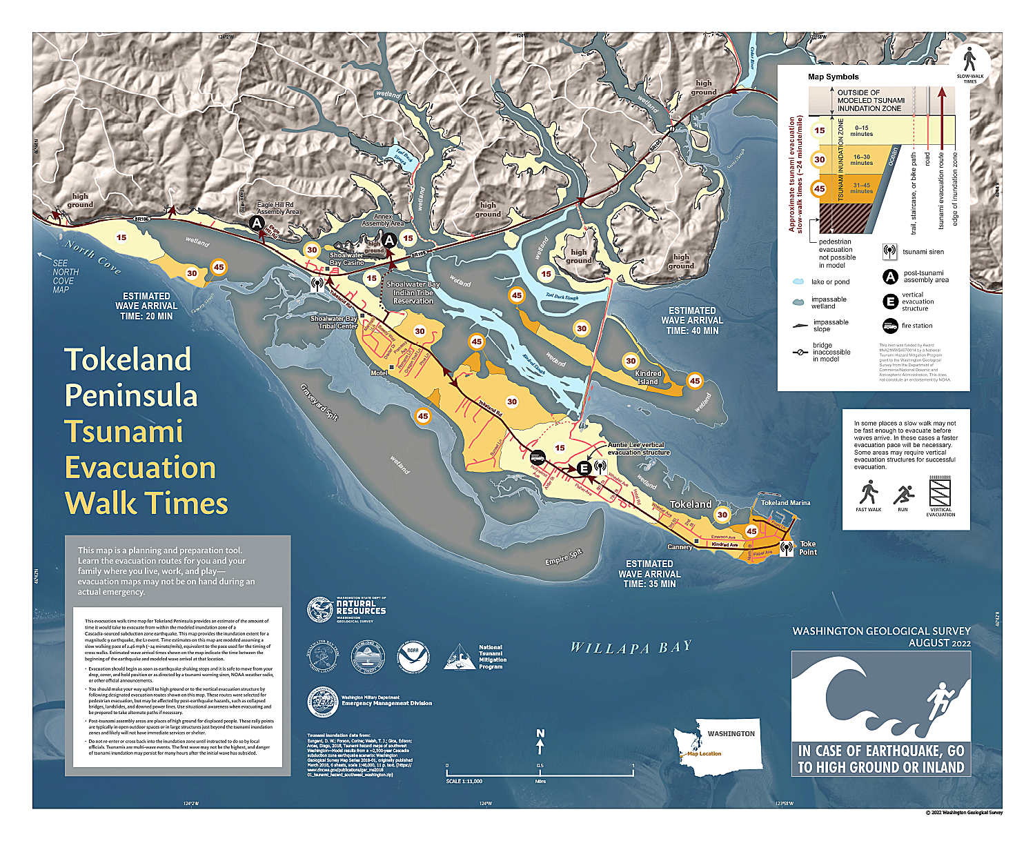 - Complete pedestrian evacuation maps: Tsunami evacuation maps assist coastal residents and visitors in finding high ground in case of a tsunami. Look for published evacuation maps on our website. Coordinate with Washington Emergency Management Division and the Washington Geological Survey to identify evacuation routes and design maps for your community.